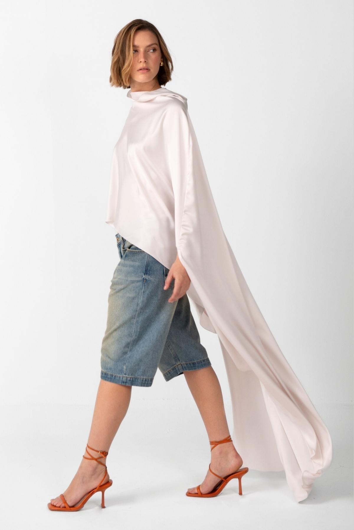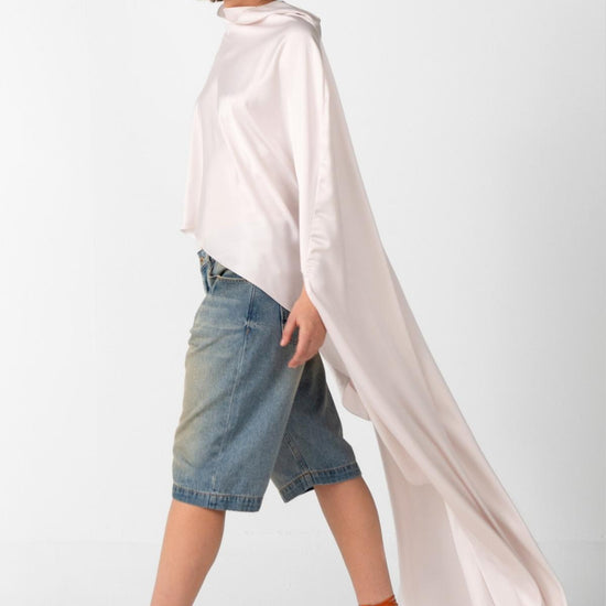 Esta pieza tipo capa, de corte asimétrico, está confeccionada en seda de la más alta calidad. Su fluidez y caída natural la convierten en una prenda versátil, capaz de transformarse según los complementos y accesorios que elijas. Un diseño atemporal que fusiona elegancia y movimiento con un toque de distinción.
