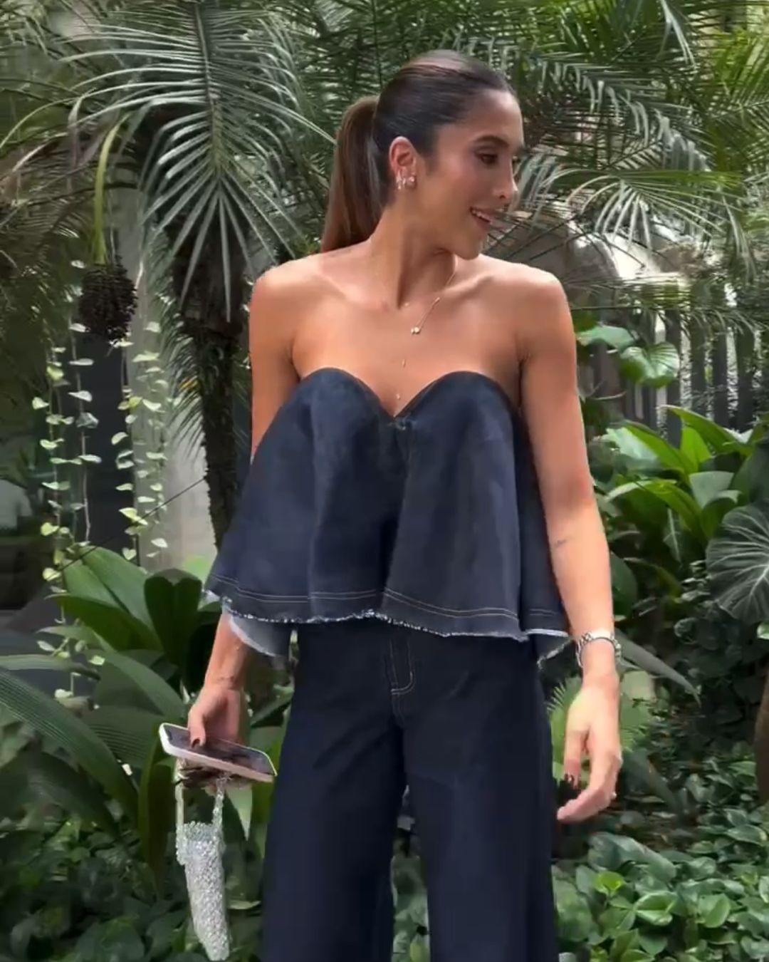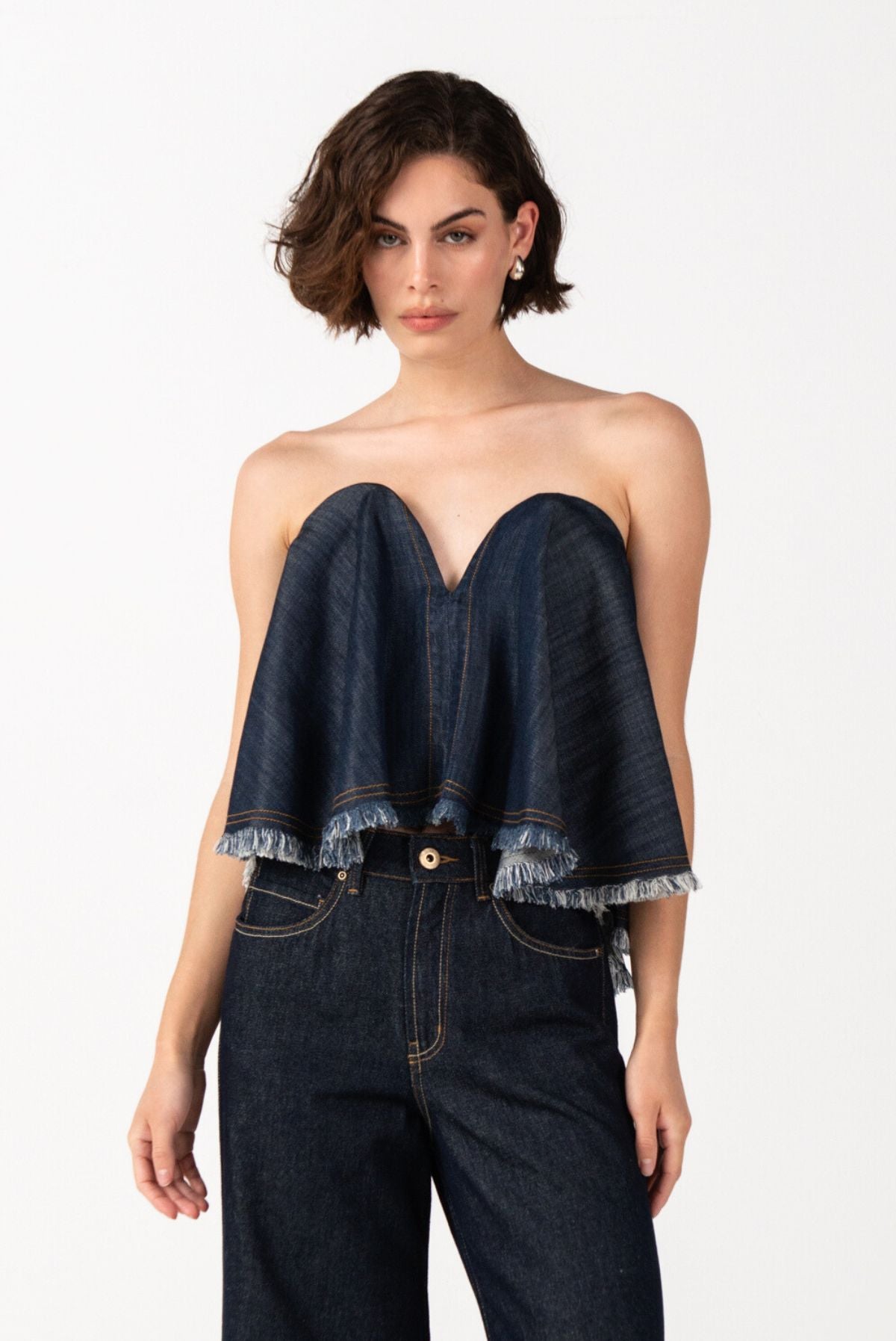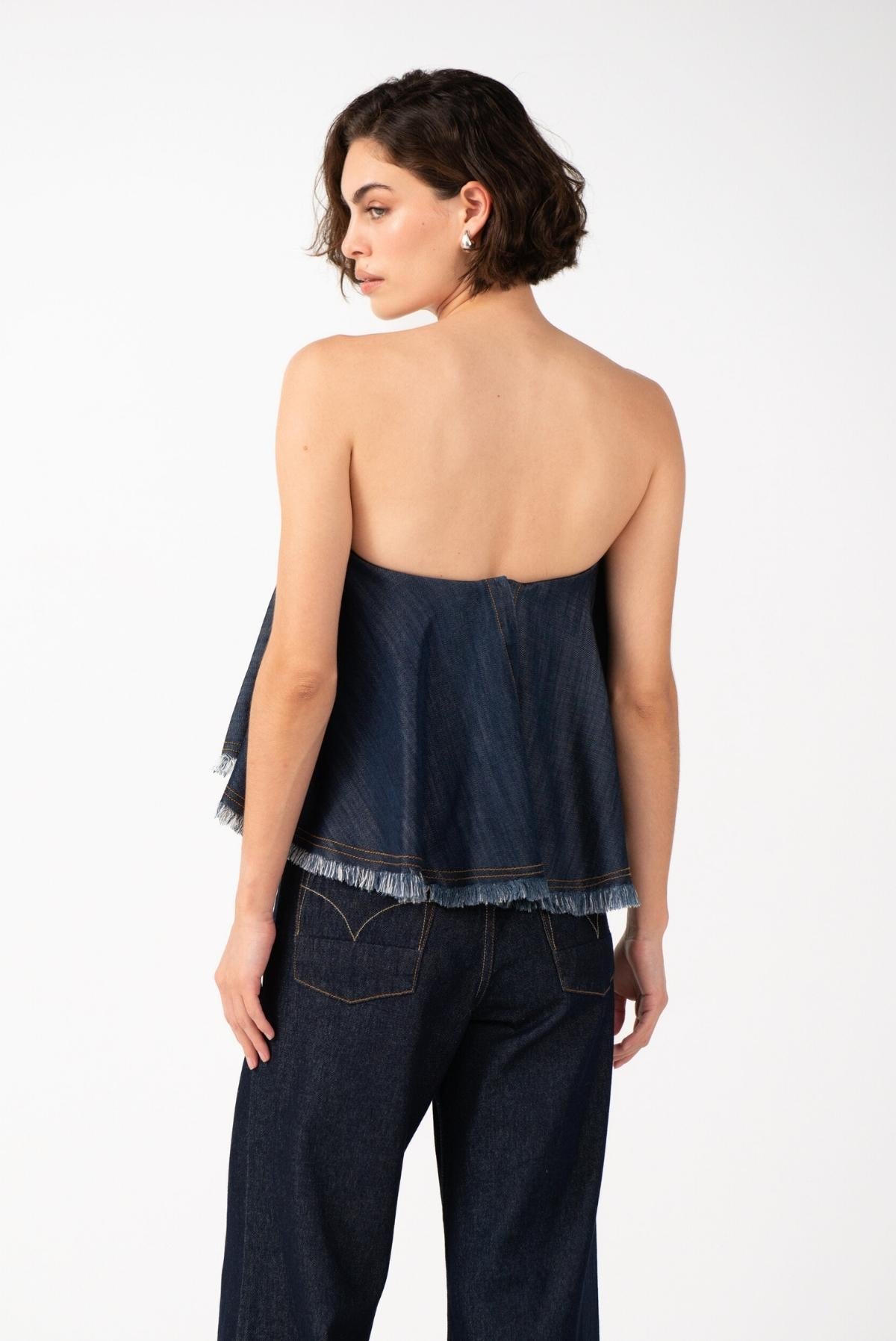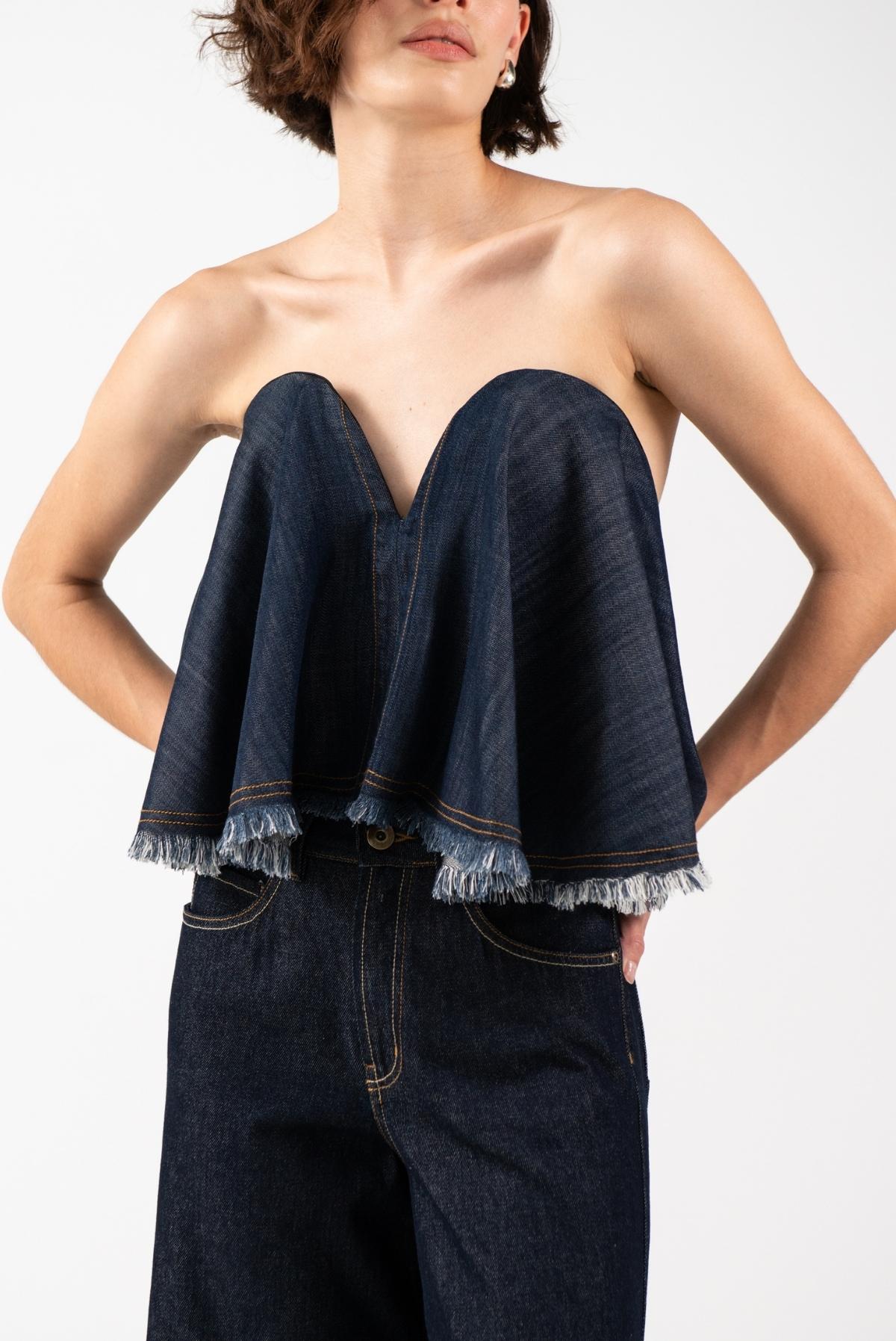 Esta pieza está confeccionada en índigo liviano. Su silueta amplia aporta dinamismo y un aire divertido, mientras que el escote en forma de corazón y su estructura interna tipo corset brindan soporte, sensualidad y comodidad. Los acabados rústicos le otorgan un carácter auténtico, logrando un equilibrio perfecto entre la suavidad femenina y la fuerza del denim.