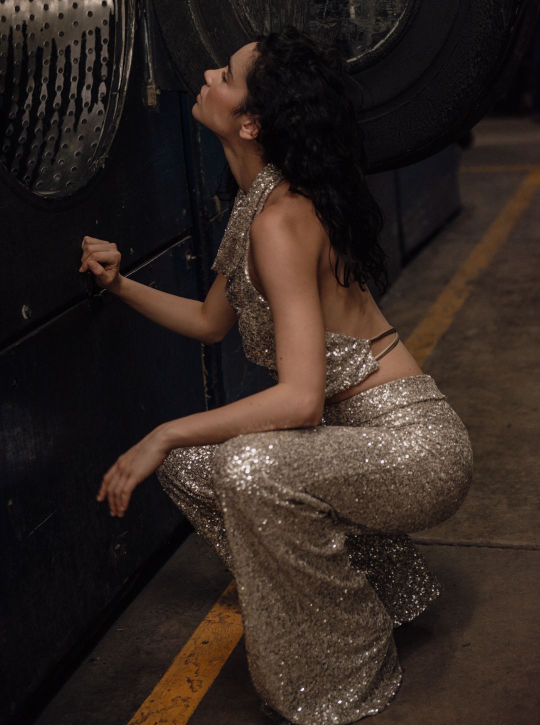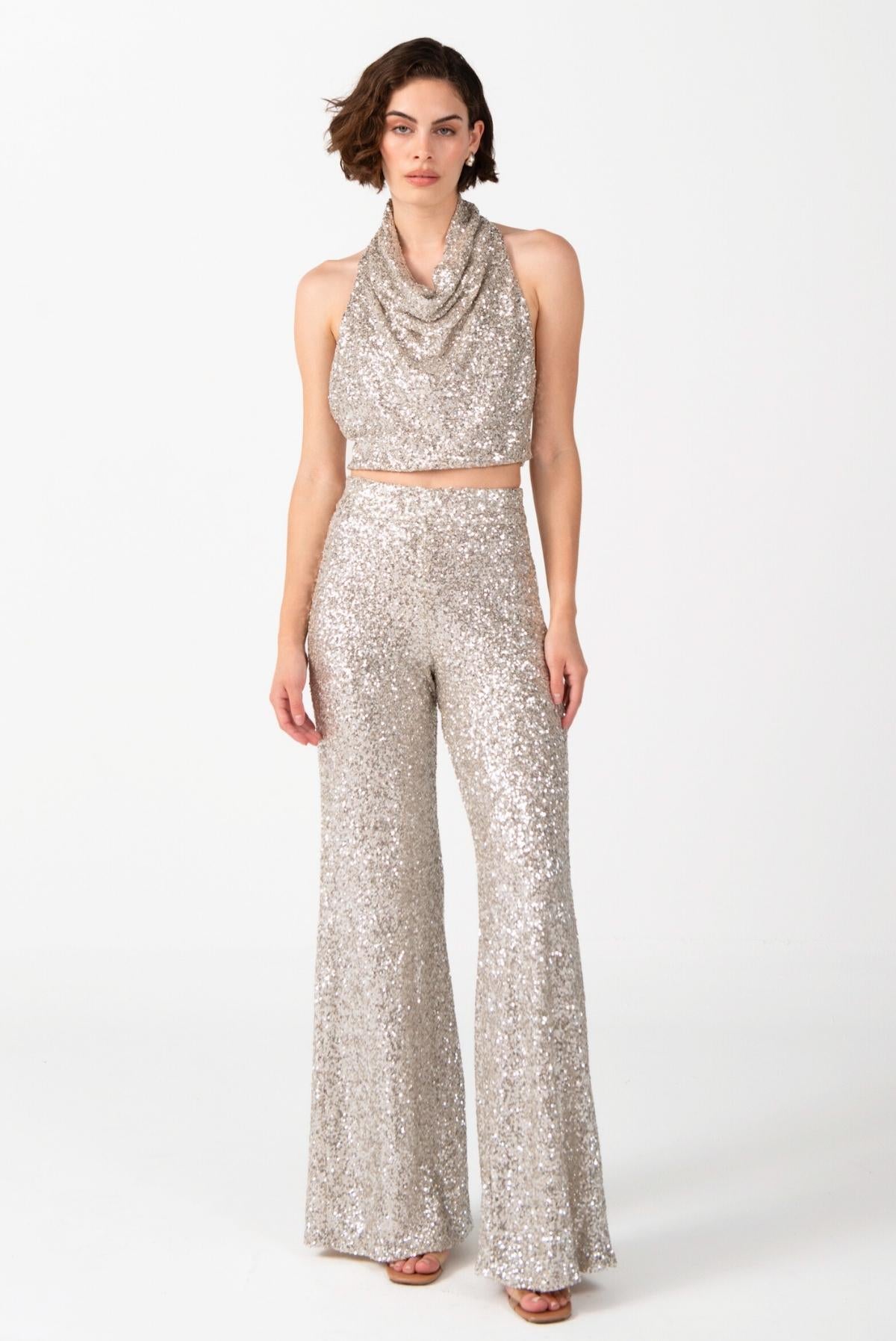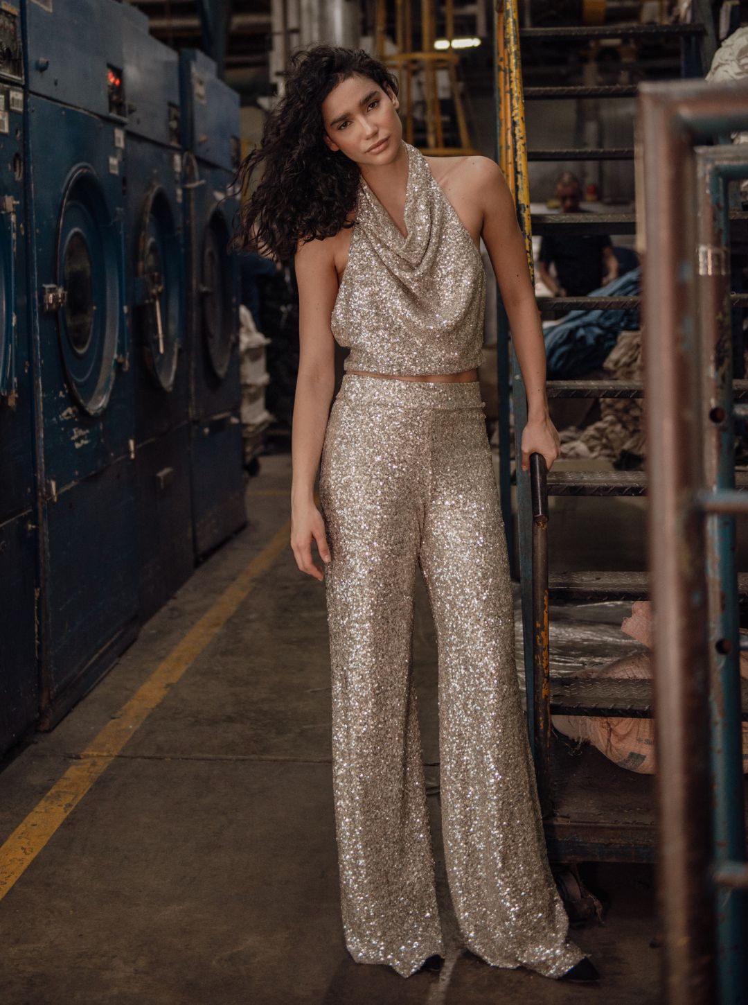 Esta pieza, confeccionada en mini lentejuelas, presenta un cuello halter drapeado y una espalda descubierta que enmarcan la silueta con elegancia y encanto. Una prenda pensada para destacar en momentos icónicos, irradiando sofisticación y glamour.