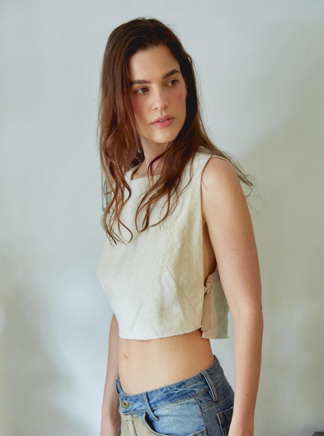 Esta pieza está confeccionada en lino natural de la más alta calidad. Su diseño de costados abiertos y líneas depuradas aporta una elegancia natural, resaltando la silueta con sutileza y frescura. Una prenda versátil que equilibra sensualidad, estilo y sofisticación en cada uso.