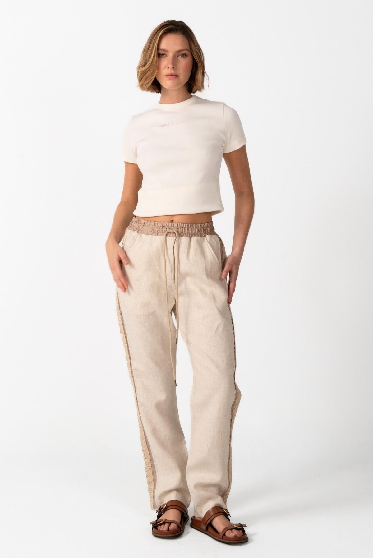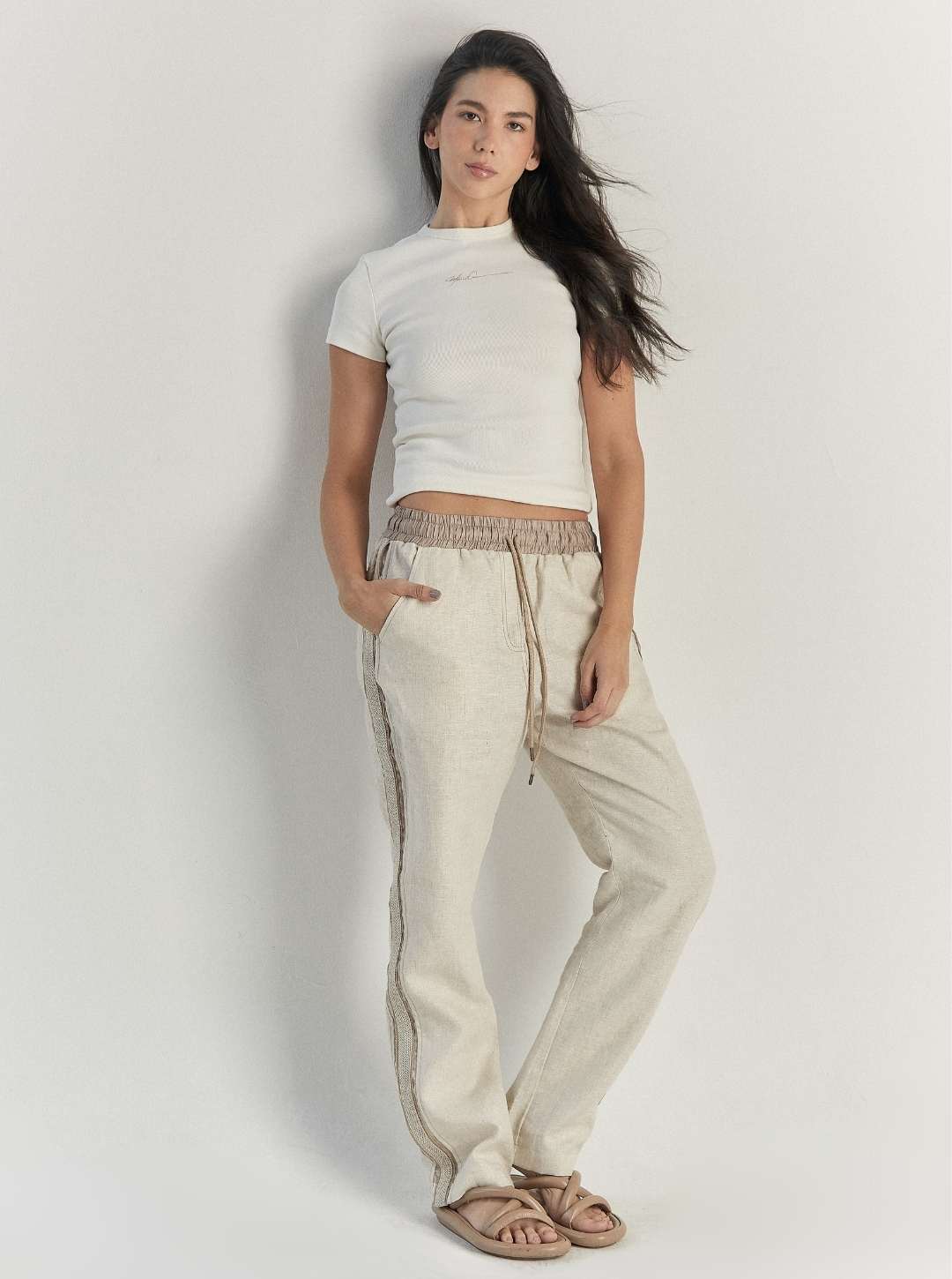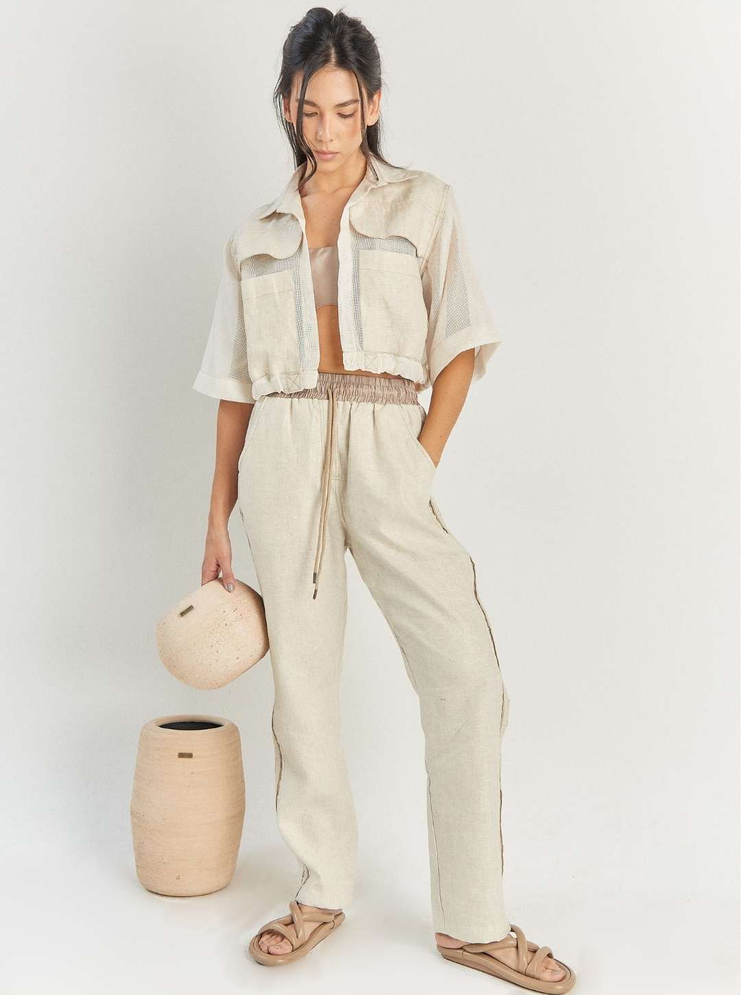 Esta pieza está confeccionada en lino, ofreciendo frescura y comodidad. Su diseño combina una estructura de aire semi deportivo con costados en organza, creando un balance perfecto entre lo urbano y lo refinado. La fusión de estos materiales aporta un efecto sutilmente translúcido que realza la silueta con un toque moderno y sofisticado.