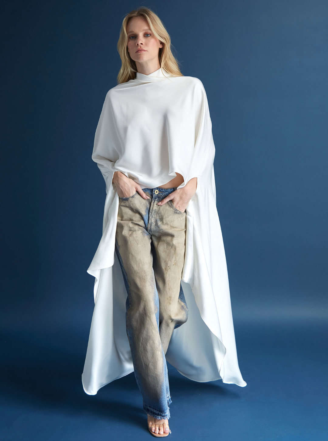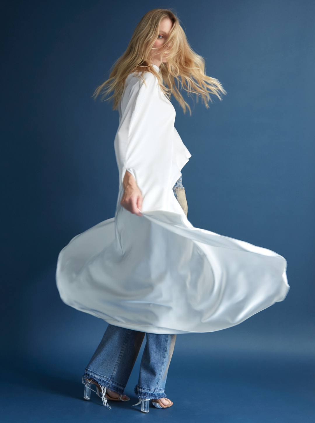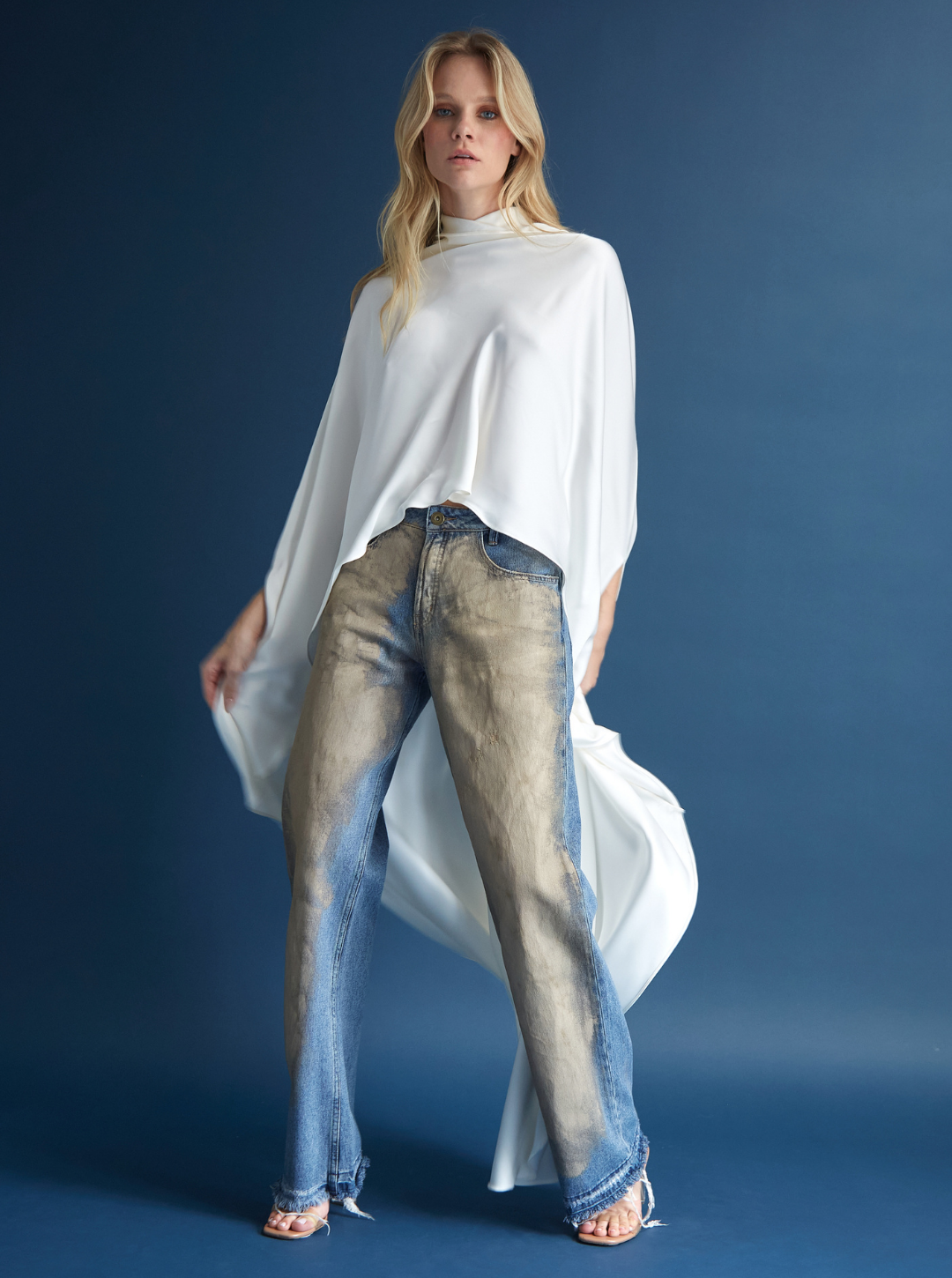 Esta pieza, confeccionada en índigo premium comfort, ofrece una sensación de suavidad y frescura. Su cotilla removible se ajusta con botones de lujo que revelan una abertura en la pierna izquierda, aportando un toque de sensualidad y feminidad. Una prenda con gran estilo, ideal para destacar con elegancia y confianza.