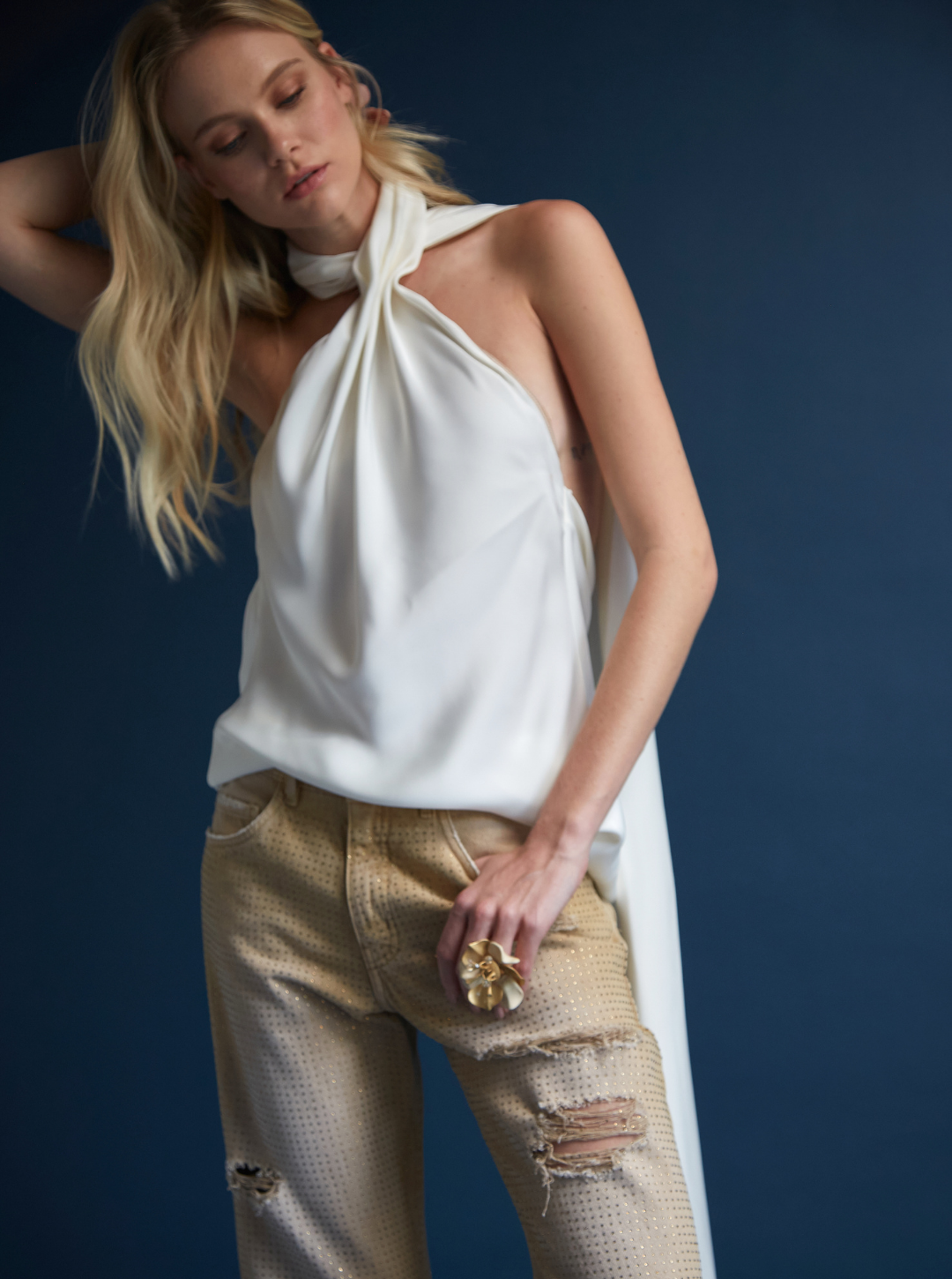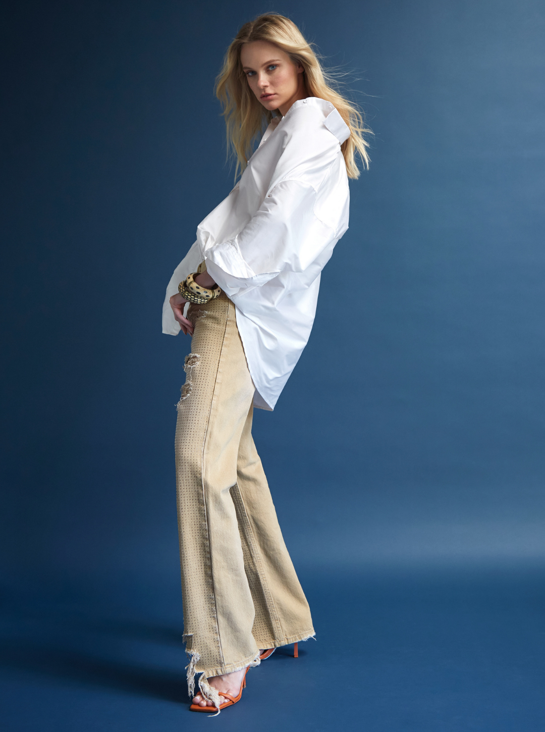 Este jean es una pieza única confeccionada en denim especial para teñir, tratado con un tinte exclusivo que, al pasar por un proceso de lavandería industrial, revela un acabado personalizado e irrepetible. El contraste entre la textura desgastada y el sutil destello de mini cristales a tono crea un equilibrio fascinante entre lo urbano y lo sofisticado.