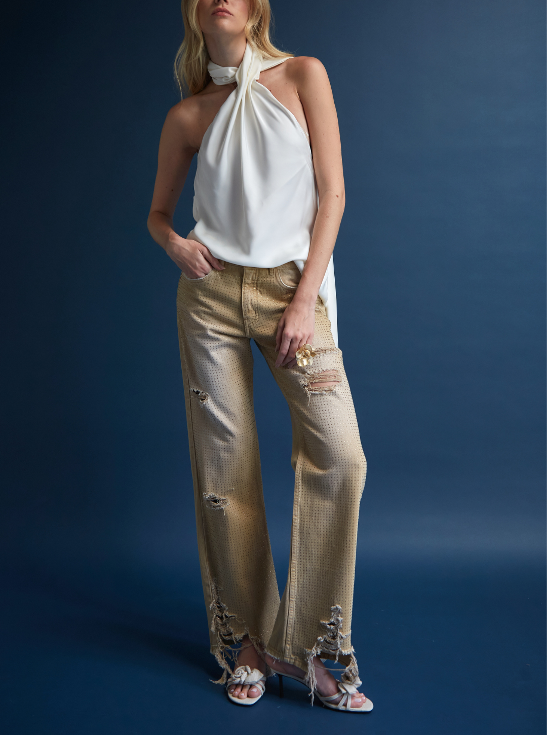 Los rotos estratégicos y el ruedo desflecado transmiten una actitud desenfadada y relajada, mientras que el brillo delicado aporta un toque audaz y elegante.