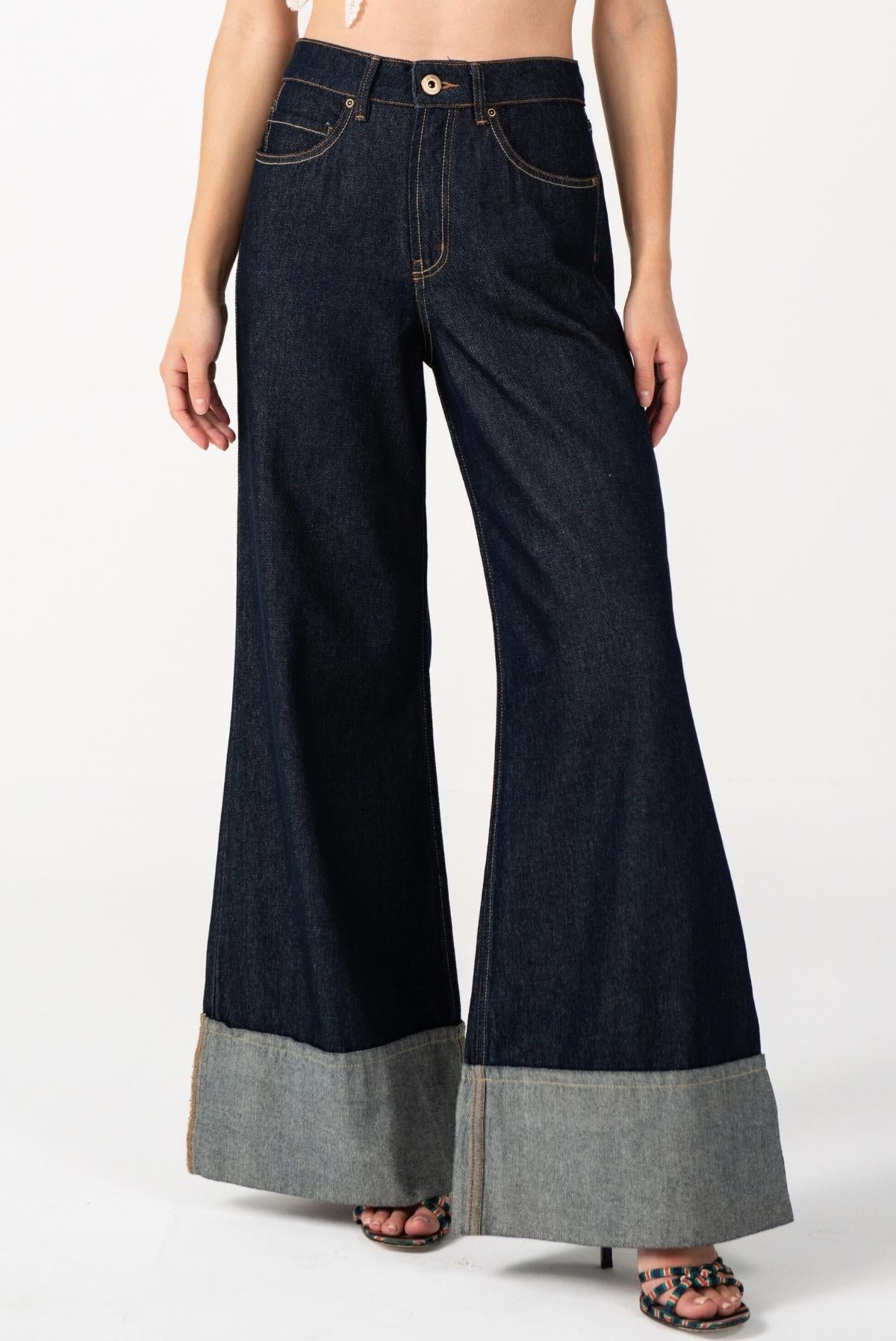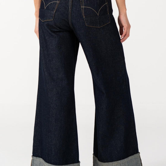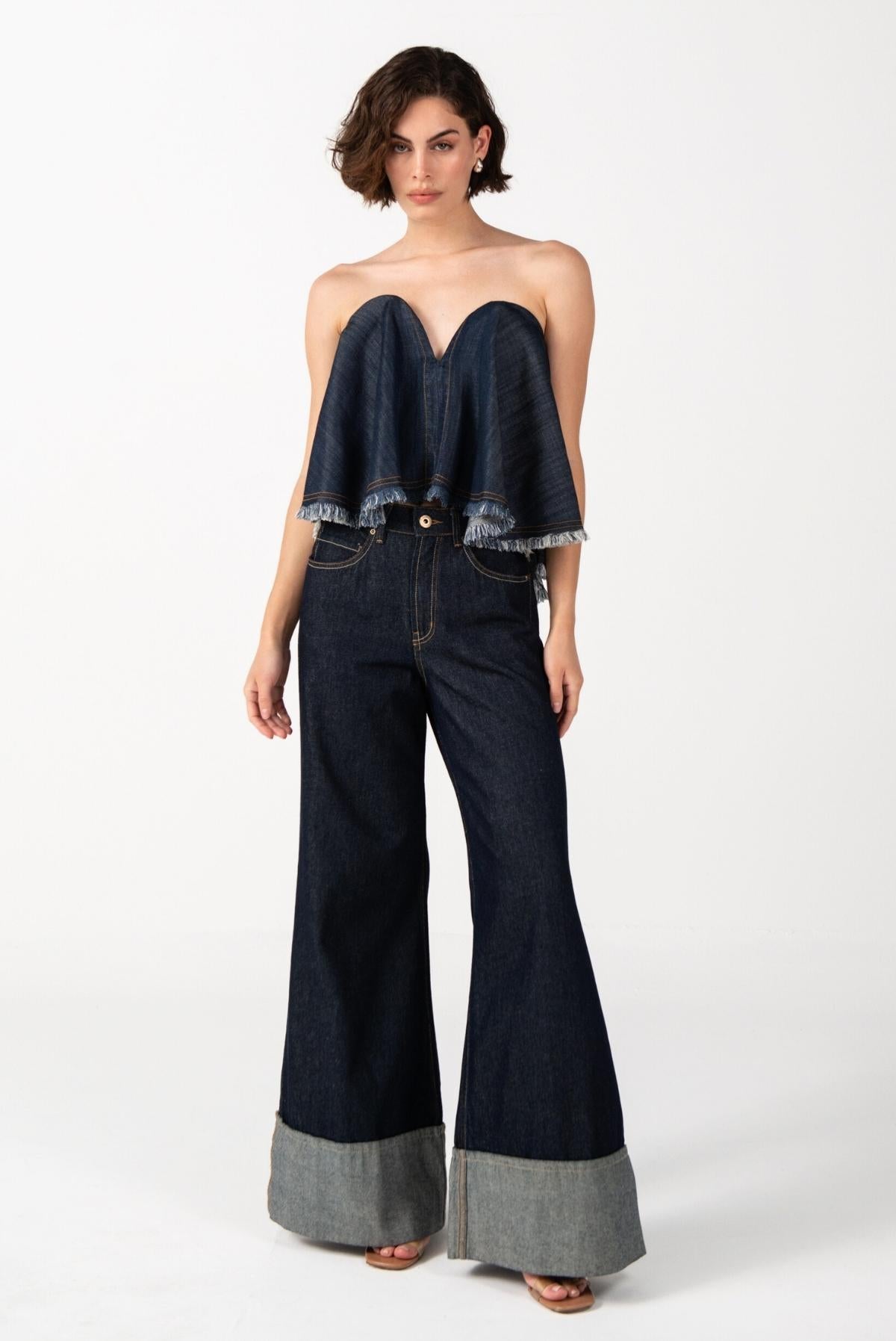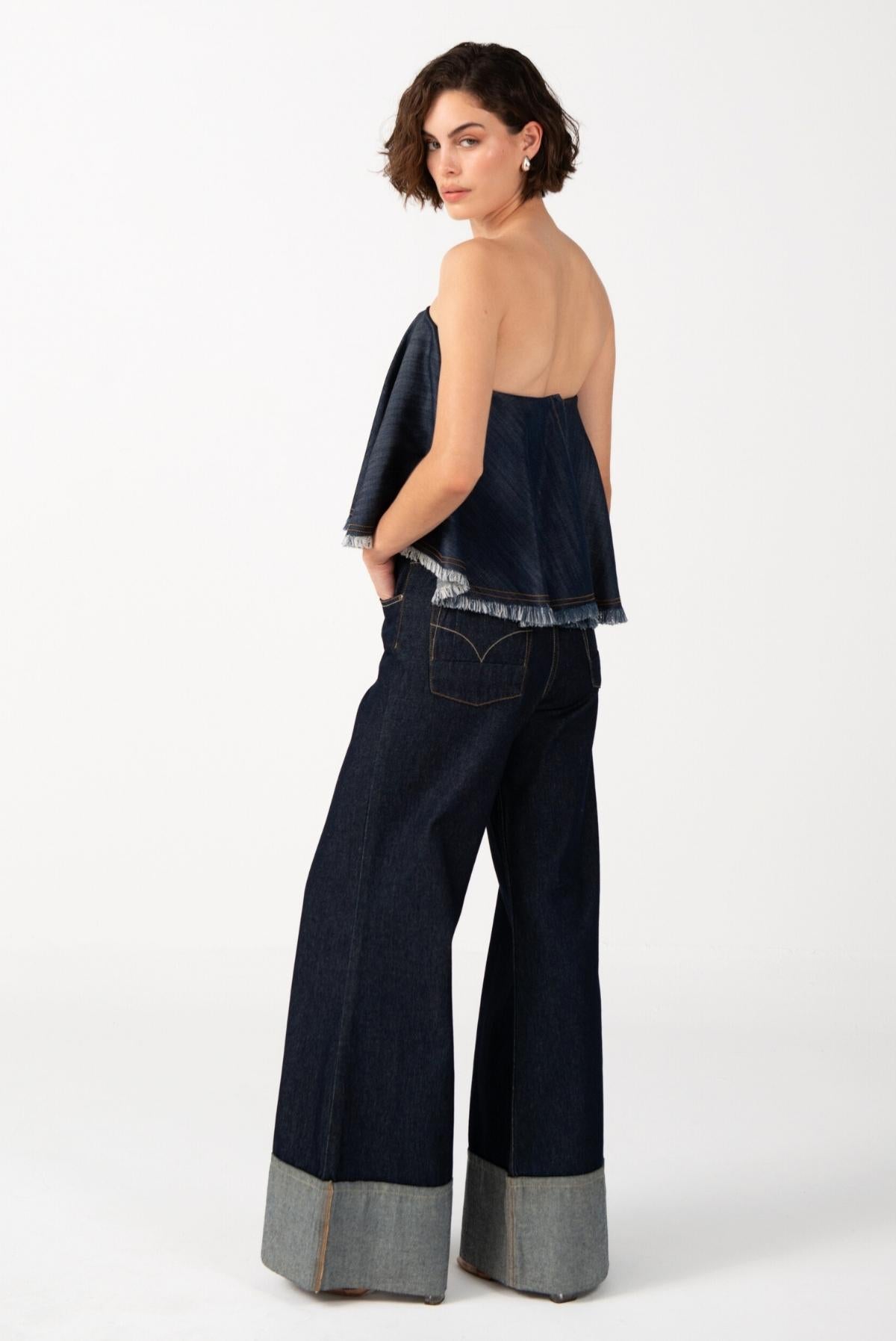 Esta pieza está confeccionada en denim. Su acabado natural conserva el tono puro y la textura original del tejido, resaltando su autenticidad. La silueta de bota ancha y el dobladillo expuesto revelan el reverso de la tela, creando un contraste sutil que aporta un guiño contemporáneo a una prenda esencial.