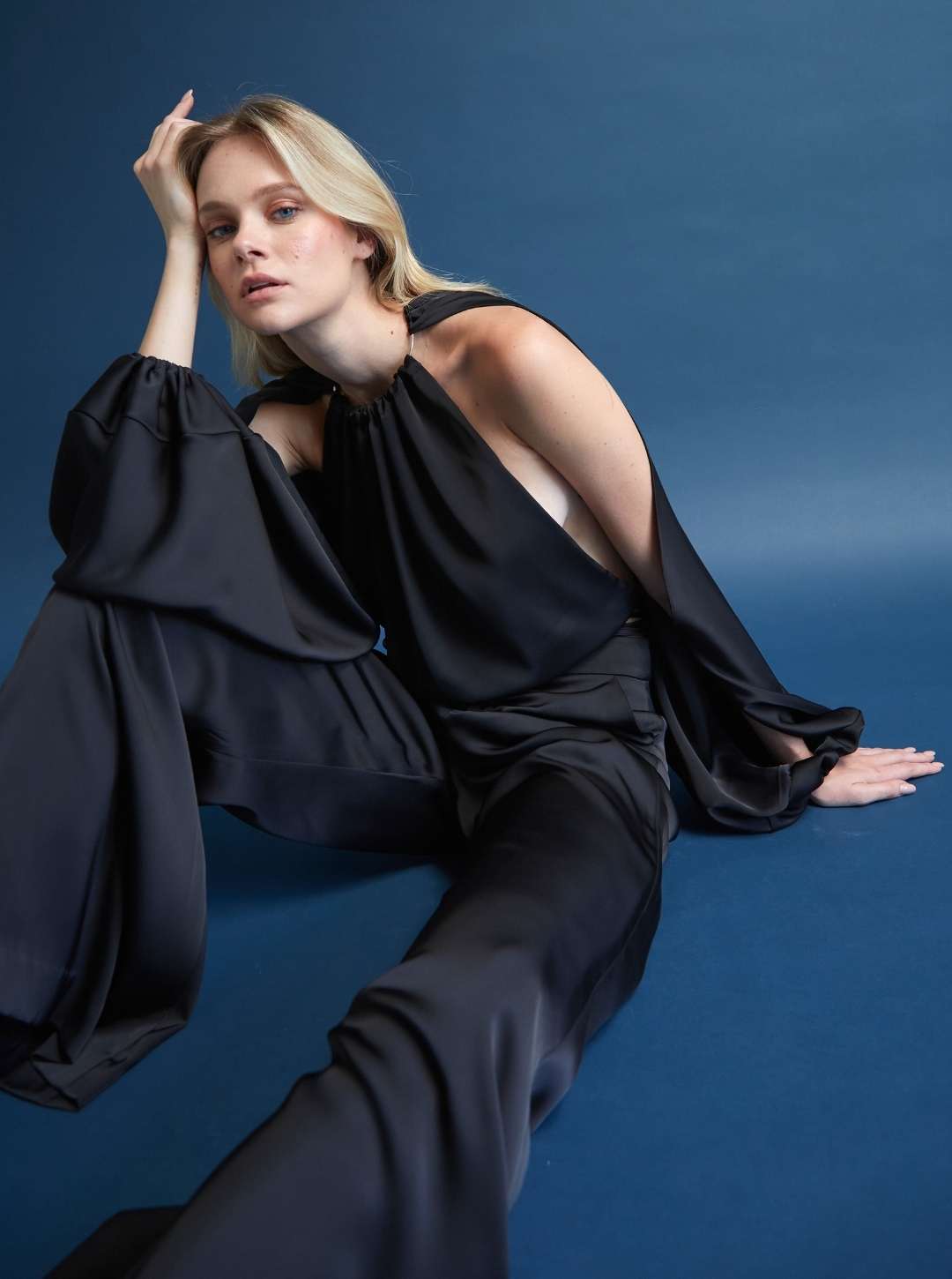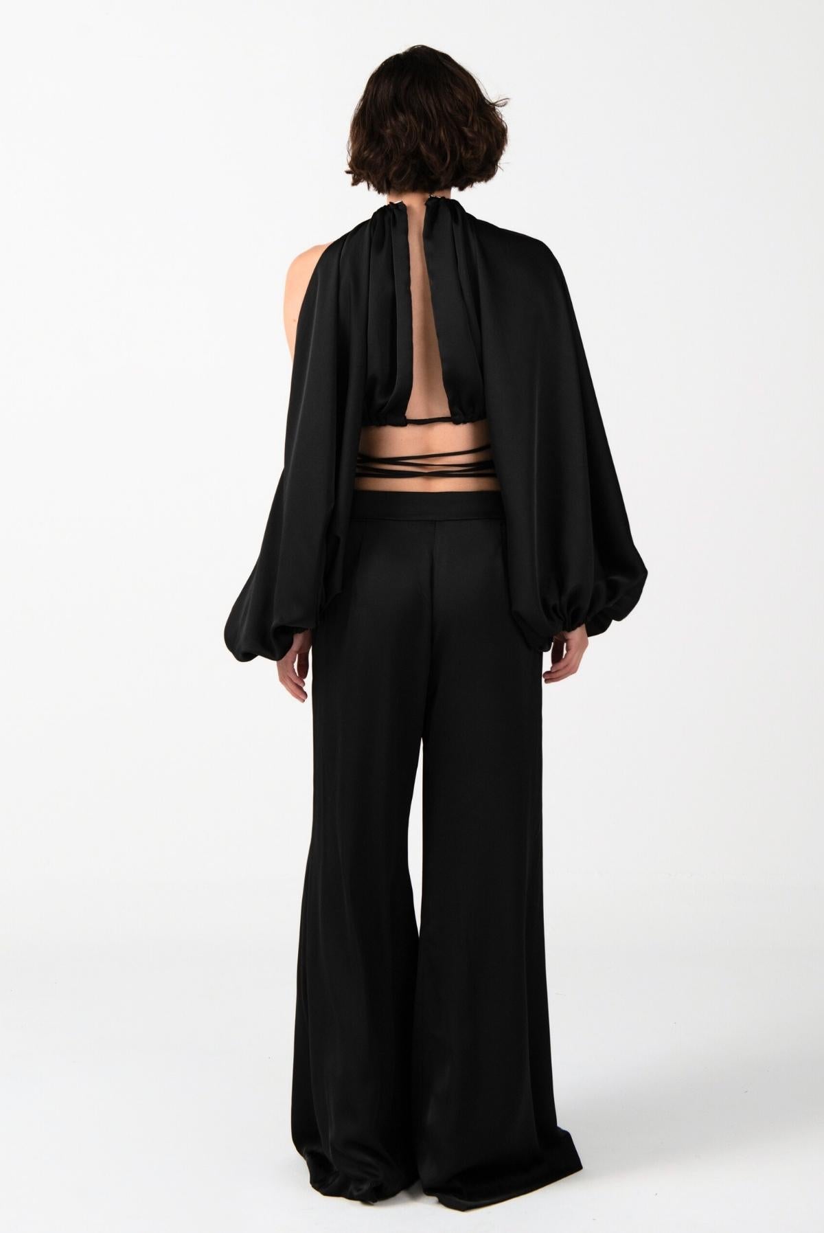 Esta pieza está confeccionada en seda. Su diseño de pantalón clásico se realza con la fluidez y la caída elegante de la tela, creando una silueta ligera y sofisticada. Una prenda versátil que combina la comodidad del movimiento con un acabado delicado y femenino, ideal para elevar tu día a día o acompañarte con sutileza en ocasiones especiales.