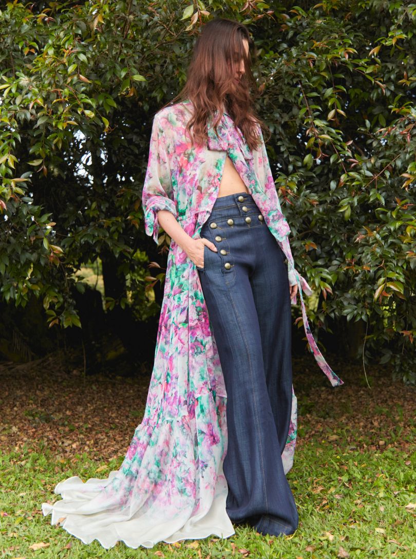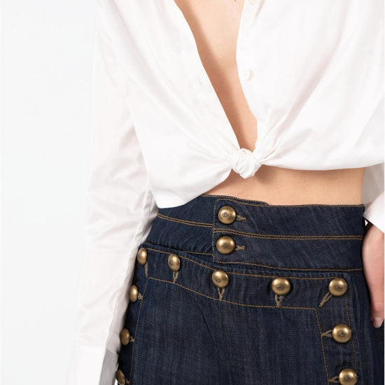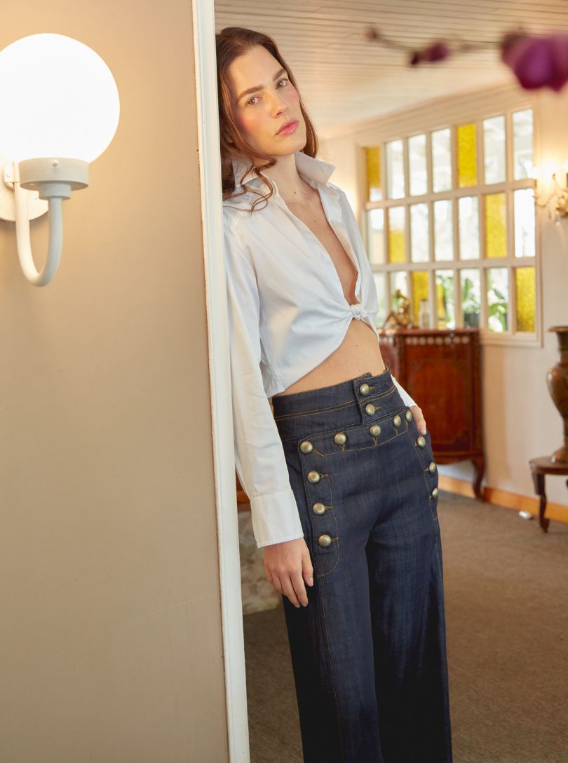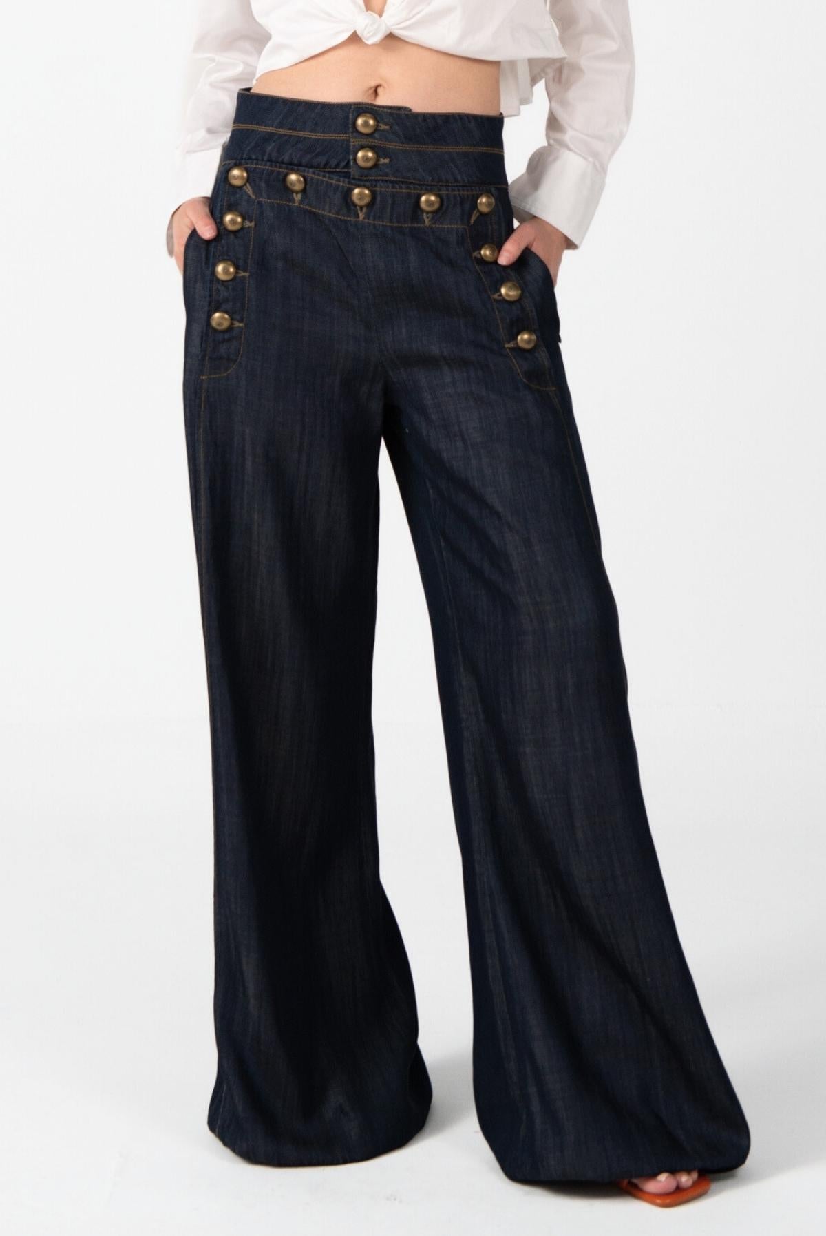 Confeccionada en denim con acabado agua, esta pieza presenta una silueta amplia y fluida que combina confort y elegancia relajada. Una hilera de botones metálicos, cuidadosamente incorporados, actúa como elemento distintivo que realza la exclusividad del diseño. Las costuras visibles con acabado tipo jean y el ruedo ancho aportan estructura y carácter, transformando este pantalón en una propuesta versátil que fusiona autenticidad, modernidad y actitud.