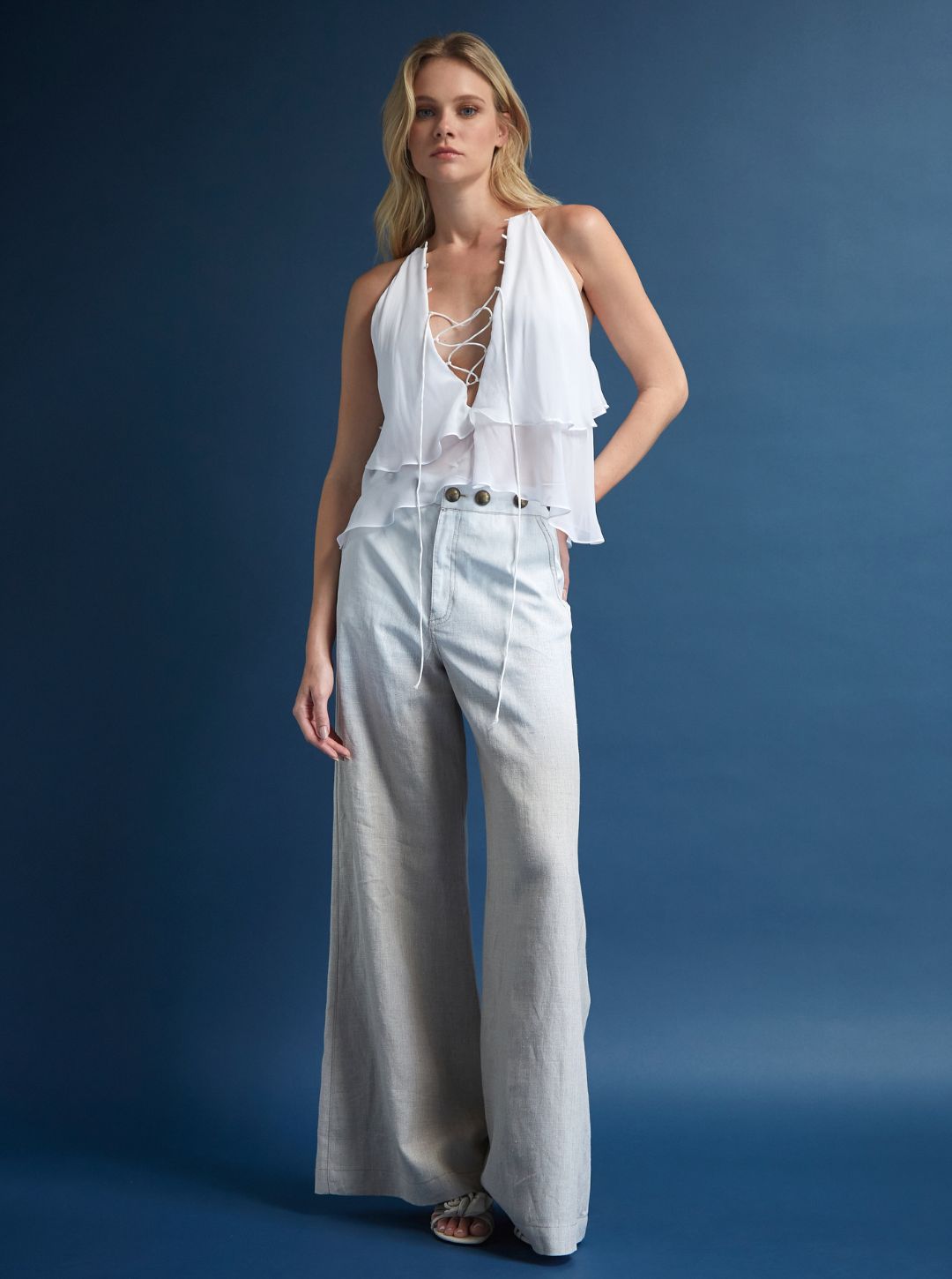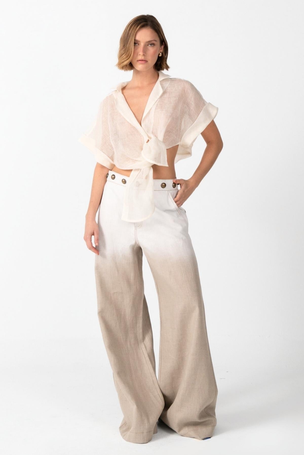 Confeccionada en lino de alta calidad, esta pieza reinterpreta el pantalón clásico a través de un enfoque artístico y contemporáneo. El detalle de pintura manual en degradé, aplicado mediante técnica de brochazos, junto con los taches metálicos en la cintura, aporta un acabado expresivo y lleno de carácter. Una prenda versátil que fusiona arte y funcionalidad, ideal para quienes visten con autenticidad y actitud decidida.