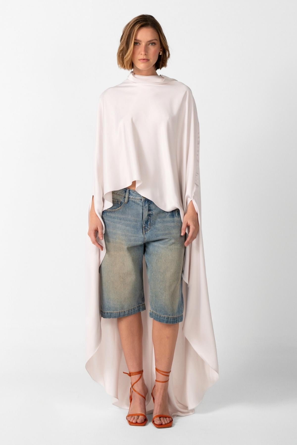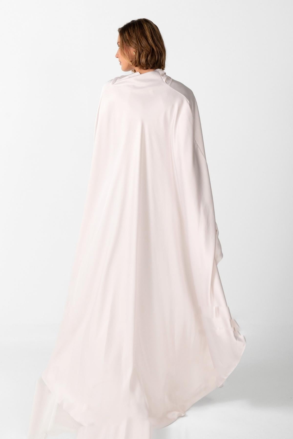 Esta pieza tipo capa, de corte asimétrico, está confeccionada en seda de la más alta calidad. Su fluidez y caída natural la convierten en una prenda versátil, capaz de transformarse según los complementos y accesorios que elijas. Un diseño atemporal que fusiona elegancia y movimiento con un toque de distinción.